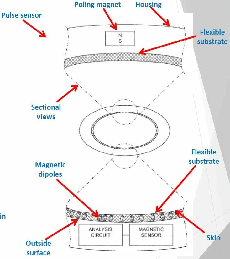 - The flexible substrate with magnetic dipoles can be held against an artery in the wrist, or against a carotid artery in the neck.
